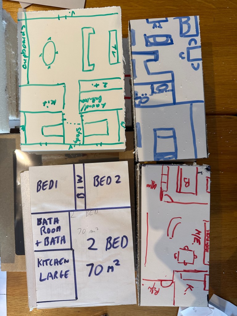 Then we had a workshop on the design of a cohousing project. Using scale models, we designed our own individual apartment. Then we put the scale model apartments together to form a complete cohousing development. A great deal of creativity was on display.